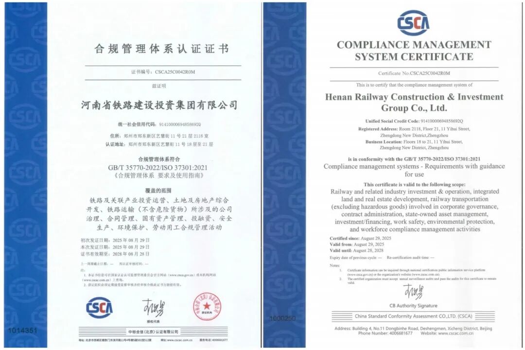 近日,河南鐵建投集團通過第三方權(quán)威機構(gòu)的綜合評審,獲得ISO37301和GB/T35770合規(guī)管理體系國際國內(nèi)雙認證,標志著集團依法合規(guī)管理水平和風(fēng)險防控能力邁上新臺階、步入新征程。